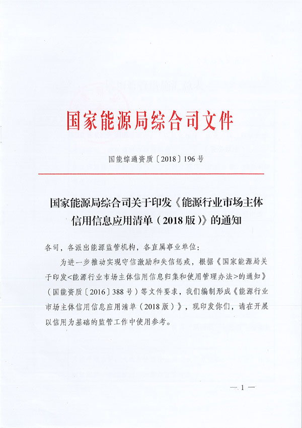 能源局综合司关于印发《能源行业市场主体信用信息应用清单(2018版)》的通知
